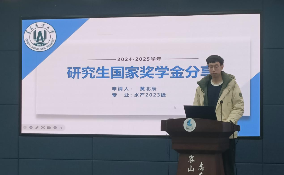 随后,2023级水产专业研究生黄北辰结合自身经历,分享了荣获国家奖学金的感悟与心得。他从目标规划、时间管理、研究方法、论文撰写及综合能力提升等多方面展开,系统介绍了如何在平衡课程学习与科研任务中找准节奏,如何有效阅读文献、设计实验,以及如何积极参与学术交流、积累科研成果。黄北辰特别提到,持之以恒的努力、主动与导师沟通以及团队协作精神是其成长过程中的重要支撑。他的分享务实而生动,为在场同学提供了可借鉴的成长路径,也激发了大家追求卓越、潜心向学的热情。